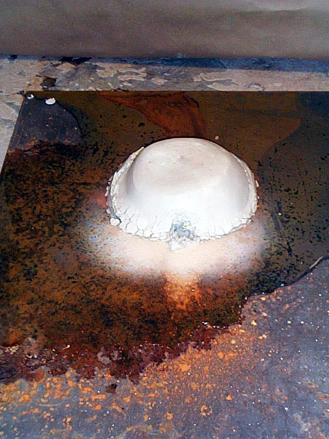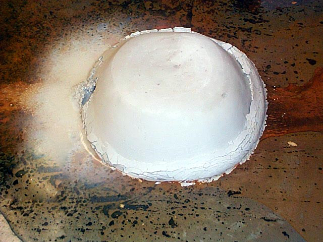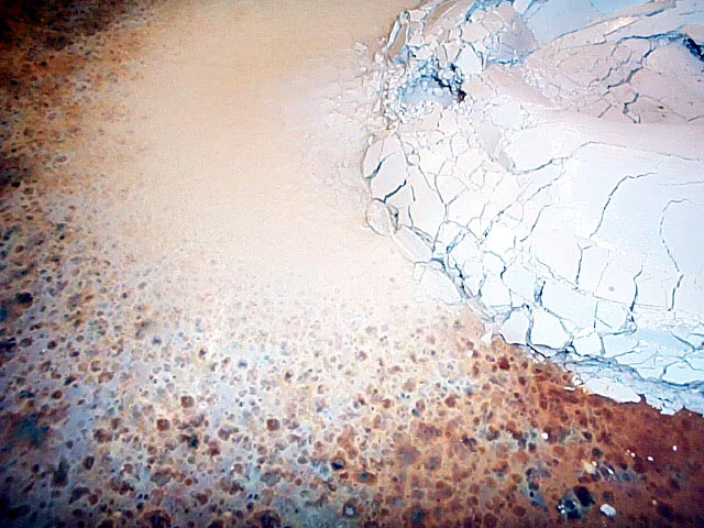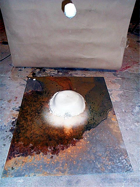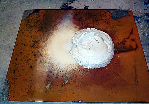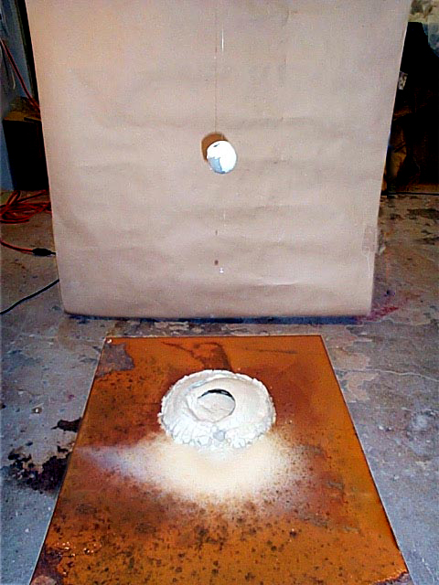 ![]() Iron Erosion I set this up with the clay orb suspended above the porcelain white clay mound. Water dripped slowly down the mono-filament suspending the clay orb and struck the mound below. The ball and the mound combined into a new object through the reagent of water. Rust formed on the steel plate as the days passed. ![]() detail ![]() Day 2 I especially enjoyed the delicate way in which the mound began to slake, and the elaborate pattern the water spots created in rust. ![]() Day 3 You can see the water frozen in mid drop. The white clay was gradually dispersed across the steel plate. The mound collapsed due to the capillary ability of the clay. Also, the steel plate's cut edge kept the water from flowing off. One of the most captivating elements of this piece was the rhythmic quality of the water traveling down the mono-filament. ![]() Day 3 Detail ![]() End ![]() I really enjoyed these colors and textures. These elements were created through the absence of my hand. I set the machine in motion and let the more appropriate mark maker take its course. |