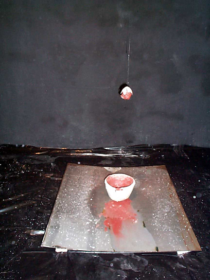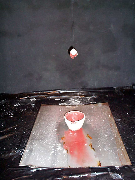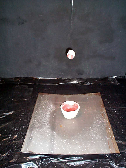 A combination of the plaster lined bowl concept and the first erosion. Rust is the coloring device.![]() RIO Begin Plaster lined bowl placed upon a sheet of steel. ![]() RIO Middle The steel was lifted off the ground so that the drop of water would resonate. The coloring of the rust is akin to blood, adding an anthropomorphic effect to the pot. ![]() RIO end Notice that the orb looks rather gruesome. It is simply rust saturated clay with a plaster shell. |