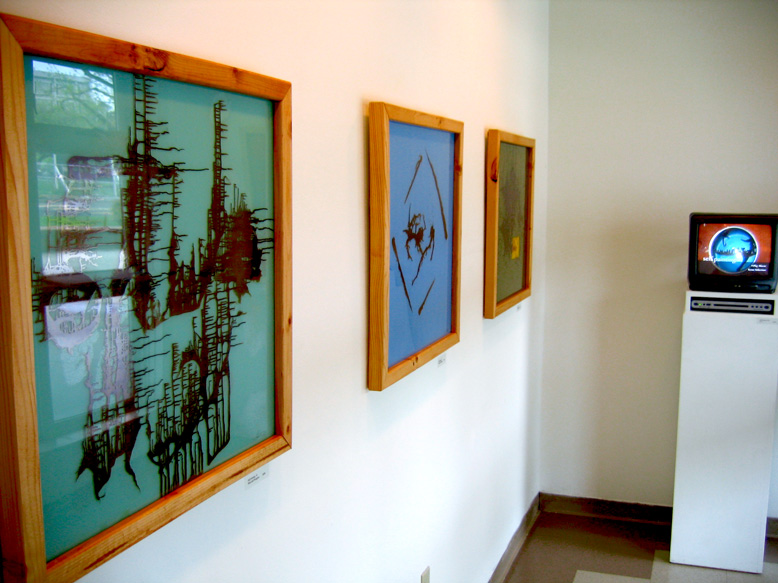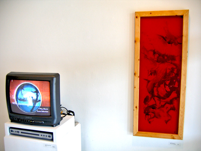 | Self Painting Show I had this show at the Craft Center gallery in 2006. Self Paintings are paintings that paint themselves. The finished paintings were shown with a looped video of their creation. ![]() Self Paintings This is an image of the left side of the show. There is the T.V. in the background with the video playing. Each one of these paintings is shown in the video. The opposite wall was a complete window, so it was annoying to photograph. ![]() Far End A close-up of the video with a flanking Self Painting In Red. ![]() Self Painting 1 This was the first painting I made. I was considering the falsification of documentation and how the "making of" is often more important then the final object. ![]() Tiny Self Paintings The video of these little guys (each one is a 3x5) was an assembly line production of them. I thought that the grid format harkened back to the mass production feel. ![]() Red ![]() Blue ![]() Greenish ![]() Stacked Glass Series In addition to the standard Self Painting format, I included this series of Stacked Glass images. There is am image placed behind two thick pieces of glass and abstract oil painting is placed between the layers. Notice all the red dots? These babies moved! ![]() Envisage I cut a hole in a violin and magnified the tiny self painting with a lens. I liked the idea of music being incorporated into the piece. I had also carefully selected music for the segments of the video. |