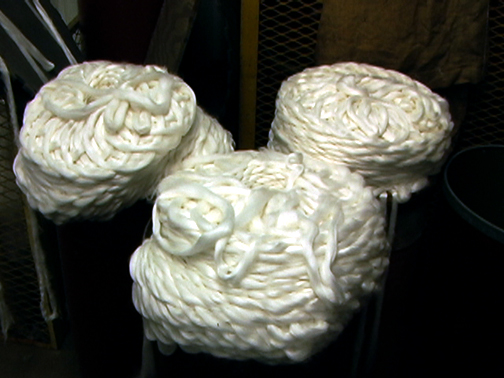 This wool is carded and ready to be spun. The tour guide stated that the sheep lived in unkempt fields as evident by the grass hulls found in it.