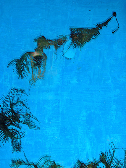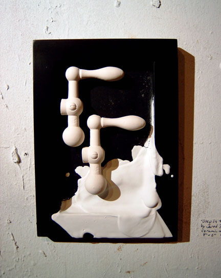 ![]() Apple and Persimmon As a preparator, I began to consider gallery installation and travel of the work. I experimented with a simple stand for the clay paper, and used India ink. The source of this was a Zen Painting called "Five Persimmons" ![]() Mound I continue to study the erosive process as a mark-maker. This was a particular successful piece. ![]() Self Painting in Blue These paintings are displayed in conjunction with a video depicting the ink traveling across the canvas of it's own accord. The kernel of investigation began with a questioning into the validity of documentation and grew from there. ![]()