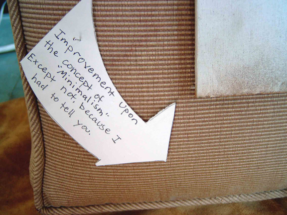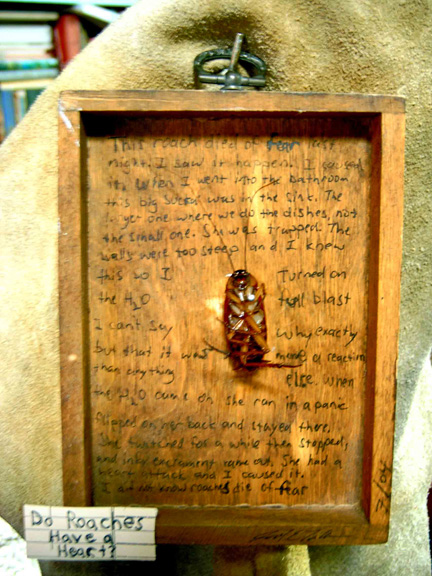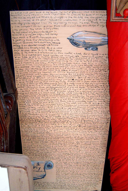![]() Burden Work is never done. A textiles reference and an ill-placed hunk of ornate metal precariously balanced over the edge of a shoddy wood construction. ![]() Hot Date A sweet little thing that came together because I found these cutout "Date" texts. Who cut them out and why I will never know. But I know that they mean now. ![]() Improvement on Minimalism ![]() Improvement on Minimalism Detail A thought about minimalism and what it was dealing with in the eyes of an artist/ jerk. ![]() Temptation The fall of man was such a set up. Look at this tiny string and obviously there is something good in there just screaming to get out. ![]() Tent Peg Purely aesthetic. I was fascinated with the idea that this was the method of securing the walls of your tent back in the day. ![]() The Mapping of a Forgotten Object I found this case in the upstairs all dusty and drab. Only when I opened it did the red velvet come through. I became obsessed with finding out what the case housed. There were wear marks in the velvet and I attempted to discover what the object was by marking the points of abrasion. ![]() The Mapping of a Forgotten Object Detail At first I thought it was a case for a rifle, but too many holes remain. I think it might have been some sort of scientific equipment, but I give up. ![]() Candle Stick Holder ![]() Plywood Writing The idea of furtive necessary mark making being so compelling that any surface will due so long as it is immediately available. ![]() Plywood Writing Two I really lost a bit of myself in completing these. I wrote in a stream of consciousness and attempted to completely immerse myself in the thought. It was quite demanding. ![]() Do Roaches Have a Heart? This is a story of what happened to me during my first night at Elsewhere. I scared a roach to death. ![]() Self Painting in Yellow During my time at Elsewhere I completed a Self Painting in Yellow, sort of a magician on the street sort of thing in which I was able to go out and create one of my current series using the materials on hand. ![]() Drip Plate A sounding board for my contact mic. and water drop. I projected the sound out a speaker on the street. The small purple stamp is 404, the address of Elsewhere. |